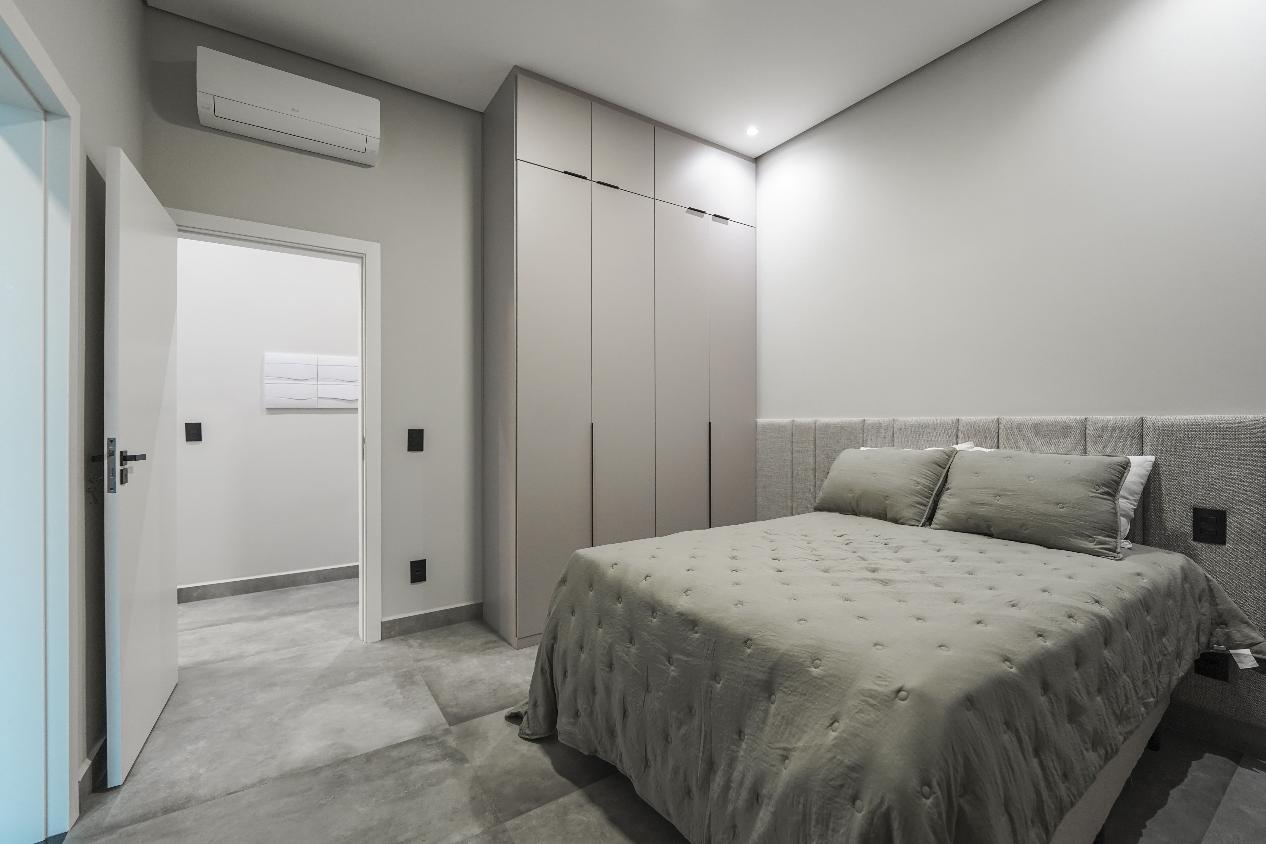 Detalhes como esquadrias em alumínio preto, iluminação embutida, infraestrutura para ar-condicionado e paisagismo completam a proposta contemporânea deste imóvel único.