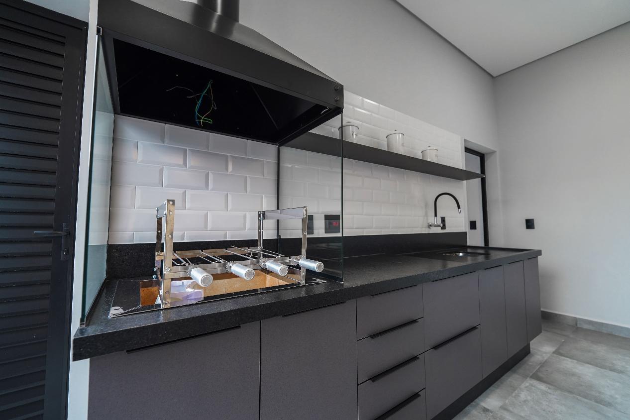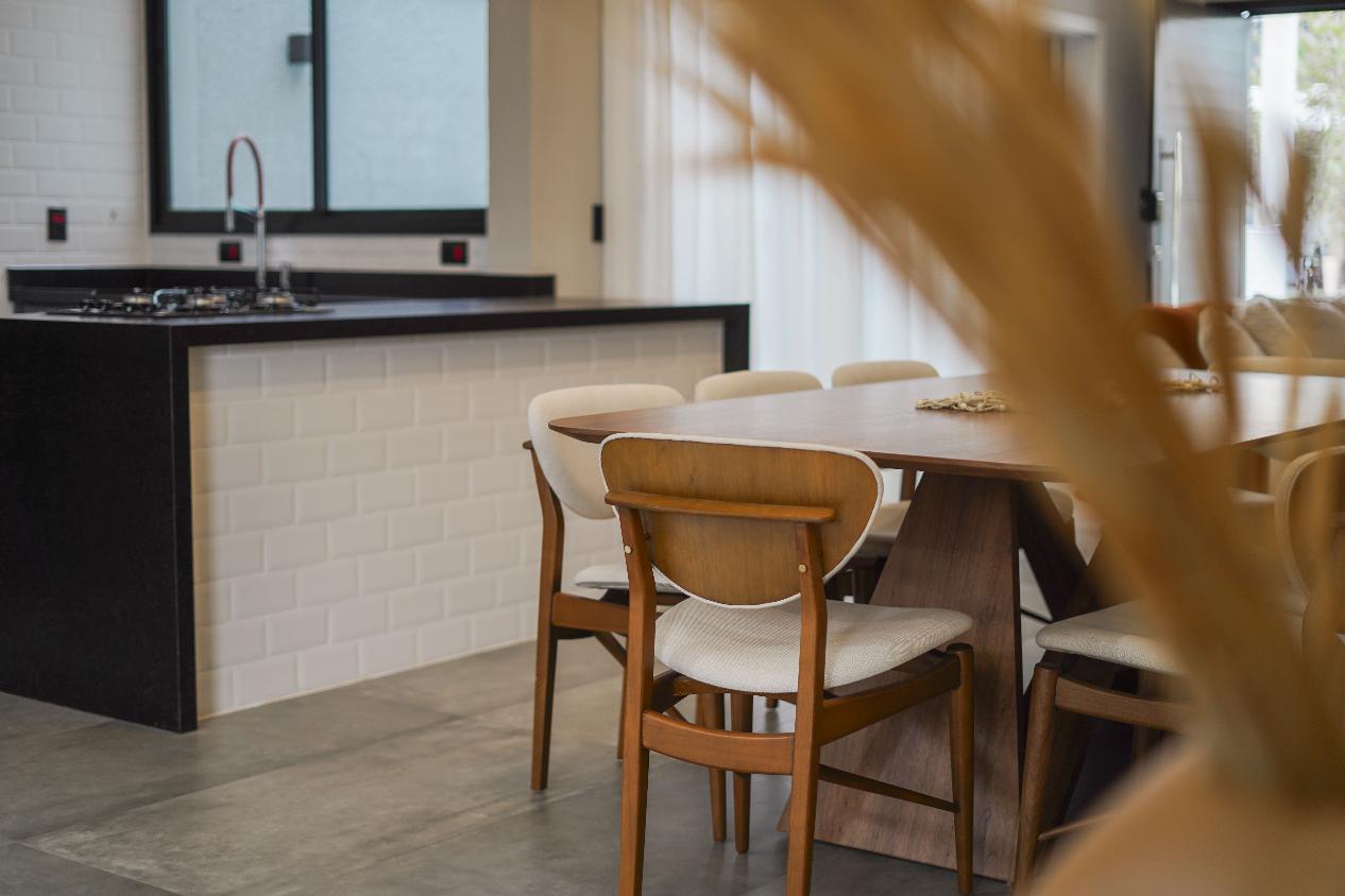 A cozinha é integrada à área gourmet com churrasqueira, cooktop e armários sob medida, ideal para receber com elegância e conforto. Destaque para o quintal com piscina revestida e deck em porcelanato amadeirado.