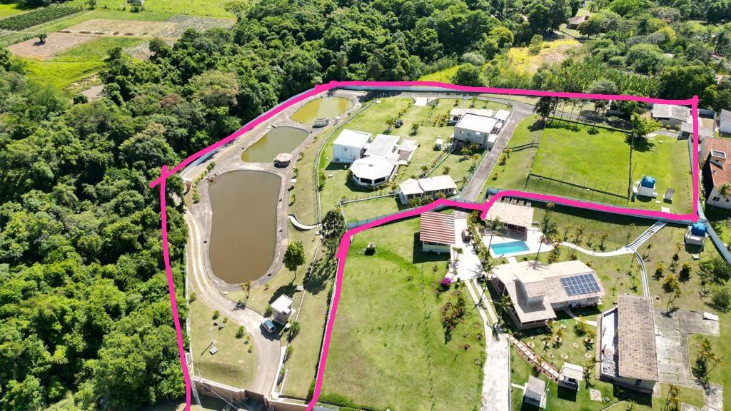 O terreno possui 22.000 m², sendo aproximadamente 13.000 m² totalmente cercados, com alambrado e telhas metálicas, garantindo segurança e controle de acesso. O restante da área é composto por mata preservada, criando um equilíbrio raro entre infraestrutura e natureza.